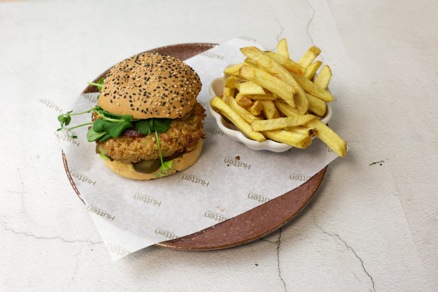 In een wereld van plantaardige, ultra-bewerkte burgers is dit een statement. De plantaardige burger van Hutten is opgebouwd uit stevige, lokale ingrediënten. De burger is gevuld met lokale groenten uit Flevoland en Brabant, aardappelen van de vruchtbare akkers in Groningen en Nederlandse quinoa, opgefrist met kruiden, chili’s en knoflook, omhuld met paneermeel en knapperig geserveerd op een burgerbroodje van Nederlands tarwe, afkomstig van verschillende boerderijen in Nederland.